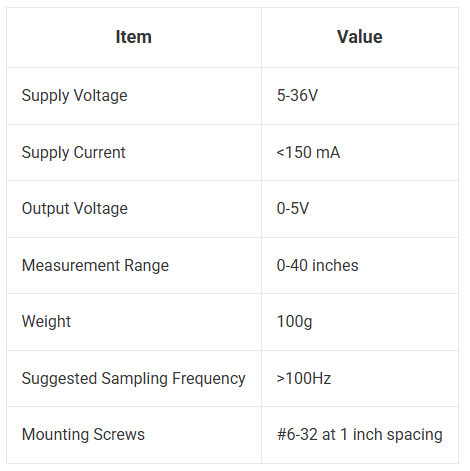 - Output is linear 0-5V to 0-39.4inches (0-100cm). At 4.8V (37.8inches) unit will clip output.